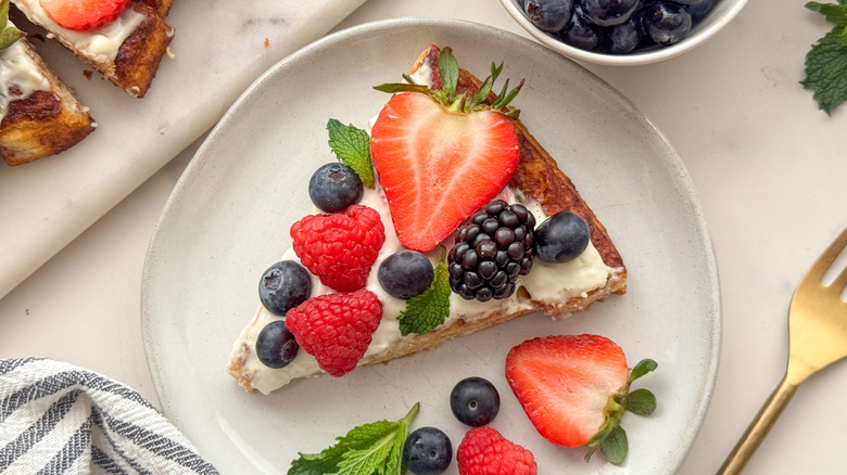 Any fruit pizza is a good pizza — but fruit pizza with a cinnamon roll crust? Now that's a show-stopping brunch entree. This recipe for breakfast fruit pizza, brought to us by developer Miriam Hahn, uses a simple can of cinnamon rolls that is pressed into a pizza pan, then baked until it becomes a pillowy base that's warm and soft with cinnamon sweetness in every bite. The next layer is a creamy maple vanilla cream cheese spread that melts into the crust adding just right texture, and the fresh berry topping with a touch of mint completes the stunning creation. You can use even mix up the fruit based on what is in season, though berries make for a timeless and crowd-pleasing addition.