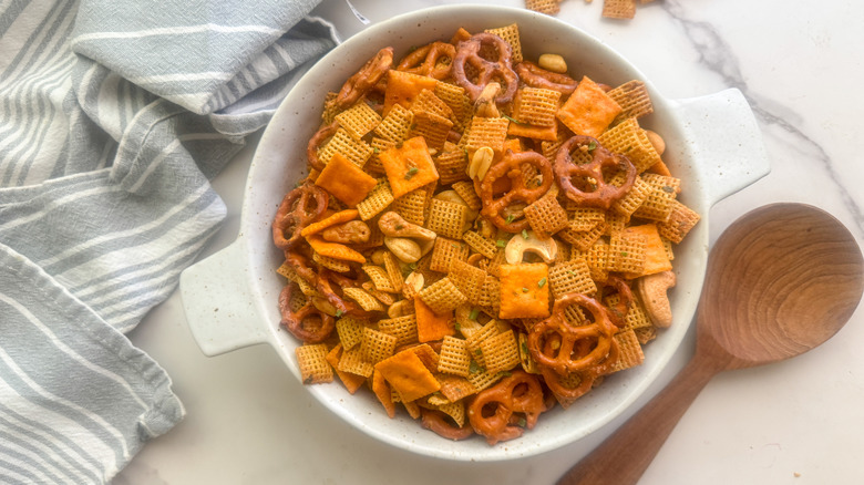 There are many ways to add a twist to the Buffalo snack mix should you feel the need to switch it up. Starting with the Buffalo sauce, try swapping it out for BBQ sauce or hot honey for smoky-sweet versions. To add some heat, add a pinch or more of cayenne pepper or red pepper flakes. There are, of course, other crunch options to add as well. Popcorn, crispy chickpeas, mini breadsticks, bagel chips, or wasabi peas all add an interesting element to the snack mix.