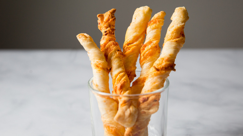 If you want to make homemade dough and go a slightly different route, you can make a type of cheese straw dough from scratch that's popular in the South. The dough is made from flour, butter, cheddar cheese, and spices, and has the consistency of cookie dough. To make the straw shapes, the dough is passed through a cookie press with a star-shaped attachment on the end. The baked straws have the perfect texture to pick up and bite into, with characteristic ridges from the press still visible on the outer surface. A cookie press isn't the most common kitchen gadget, so if you don't have one, here's a workaround. Roll the dough into a very thin rectangle, cut it into strips, and twist them like we've done with our puff pastry strips in this recipe before placing them on a baking sheet and baking.