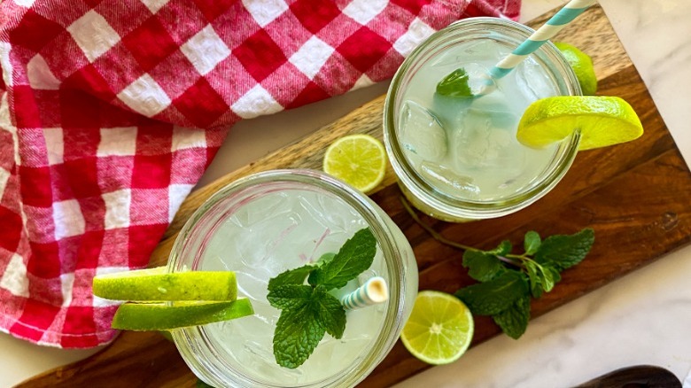 Our first necessary ingredient of course, is fresh limes. You'll need about 10 limes to get 1 cup of lime juice. If you are using key limes, you'll need several more because they tend to be smaller. "If you are buying the limes in advance," Hahn shares, "store them in the refrigerator where they will last longer. If you leave them on the counter, they harden quickly, and will not provide much juice." Hahn goes on to say, "You can also make this with bottled lime juice instead of fresh in a pinch, but using fresh is always my preferred choice." The other ingredients needed are simple — sugar, water, and fresh mint leaves.