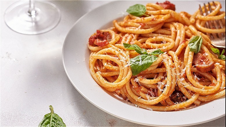 This traditional bucatini all'Amatriciana features saucy pasta, salty pork, and lots of pecorino Romano cheese.