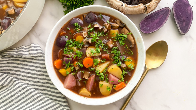 To make this recipe, we'll need a fair amount of produce so let's start our shopping spree in the produce aisle. Pick up some portobello mushrooms, potatoes, carrots, onion, garlic, and fresh parsley. "I love to use multicolored potatoes if I can find them because they don't need to be peeled and the different colors add different nutrients," Hahn remarks.