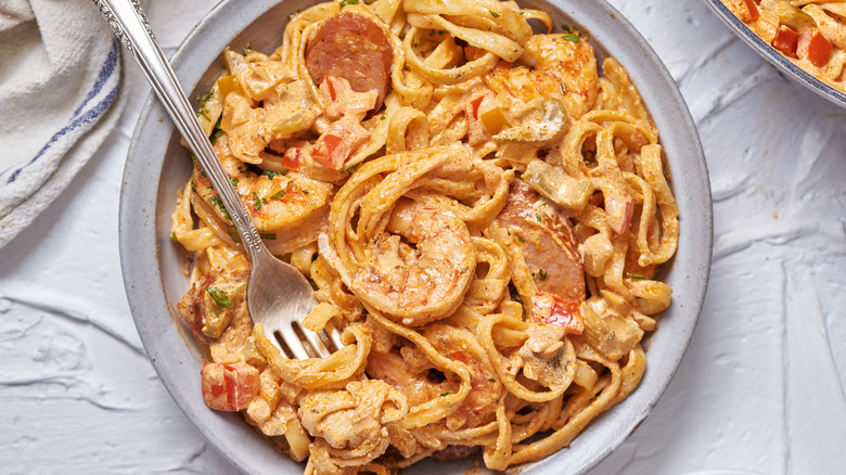 Besides shrimp, this pasta dish also contains sausage (andouille, in keeping with the Cajun theme). The preferred pasta shape is fettuccine, while the sauce is made with whipping cream, cream cheese, butter, tomato paste, white wine, chicken broth, and parmesan. The vegetables in this dish include the Cajun holy trinity of onions, celery, and bell peppers, while the seasonings include garlic, salt, and Cajun seasoning. (Want to DIY this last ingredient? Here's a recipe for homemade Cajun spice mix.) For a final touch, you'll be stirring in some parsley.