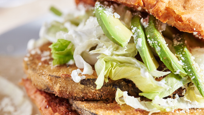 For the sandwich filling, you'll need a large eggplant, flour, egg, breadcrumbs, oil for frying, shredded lettuce, sour cream (or crema), cotija cheese, and ripe avocado. The most important ingredient, of course, is the bread, which you'll want to try and source a few days before cooking. For this, look for telera or bolillo rolls, which are both dense rolls that resemble giant hamburger buns. If you can't find these, use hamburger buns and make smaller pambazos.