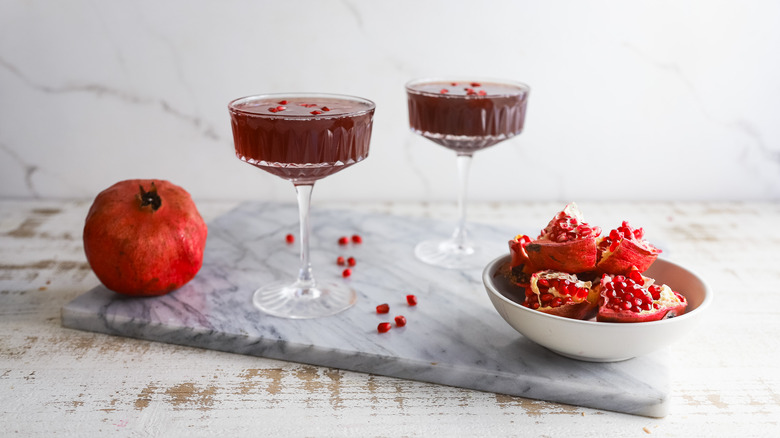 - In a mixing glass, combine pomegranate molasses, pomegranate juice, and gin.