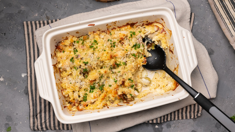 From the kitchen of Tasting Table recipe developer Jennine Rye, this dish features deliciously caramelized Brussels sprouts, chicken, and bacon in a wonderfully creamy white sauce enhanced with flavors of roasted garlic, Dijon mustard, and nutmeg. Mixed with pasta and then topped with grated cheddar cheese and fresh breadcrumbs, this pasta bake is cooked in the oven until the sauce is bubbling and the top is golden and crisp.