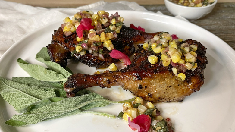 If chicken is the go-to poultry served in your home (with a seasonal turkey feature), it's time to expand beyond the usual. Switch it up by cooking duck, an excellent alternative that's packed with flavor and a succulent texture while sticking to the breast, leg, and wing combo you're already familiar with. Tasting Table recipe developer Kara Barrett shares this juniper duck with corn and sage relish, highlighting duck legs with a savory rub and tangy garnish.