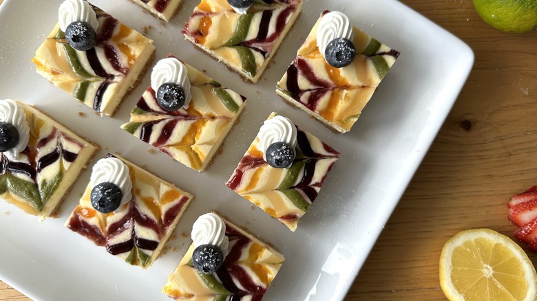 The toppings are where these cheesecake bars shine. Feel free to choose any jams or pipeable toppings you love for this purpose. Rosenhouse opted for raspberry, apricot, and blueberry jam, along with matcha green tea powder and store-bought lemon curd to represent the colors of the rainbow. Fresh blueberries placed over a rosette of fresh whipped cream add a pop of blue, but you can also achieve this by mixing some cheesecake batter with spirulina or blue butterfly pea powder for a natural blue dye.