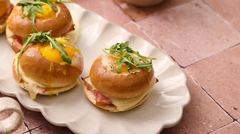 The first thing you'll want to grab, and what makes these sliders unique, are miniature bagels. They're easier to find than you'd think, as a few of the biggest bread brands have their own versions. Check the bread aisle for Pepperidge Farms and Thomas bagels, and if you can't find them there, try the recipe with one of the brands' regular-sized bagels instead. From there, head to the deli for sliced ham and sliced Gruyère — if you can't find Gruyère sliced, you can use provolone, Swiss, or Havarti. You can also shred your cheese, if Gruyère is a must-have. Then, just grab eggs, butter, salt, pepper, and arugula to finish building the sandwiches.