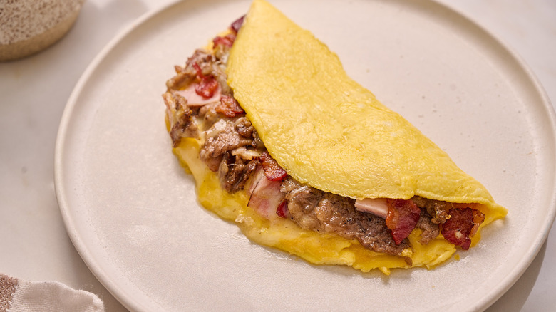 The meats you'll need for this recipe are bacon, shaved steak, and ham. Bacon is easy enough — any thickness and cut will work here, so no need to choose between center or thick cut. If your store doesn't sell steak already shaved, you can very thinly slice a strip or sirloin instead. As for the ham, look in the deli for thick-sliced honeybaked ham or use a leftover roast. From there, you'll just need omelette ingredients, which include eggs, milk, butter, salt, pepper, and cheese. For this recipe, we chose Monterey Jack cheese, which is mild and melty.