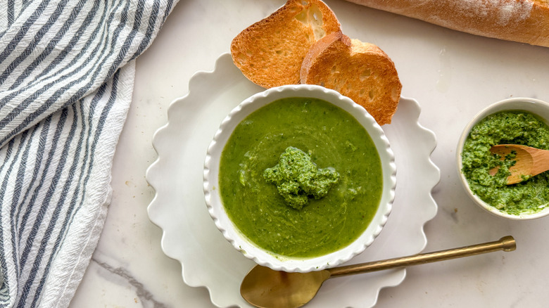 This super green soup features spinach not one, not two, but three ways - blended in, wilted in, and as a pesto garnish.