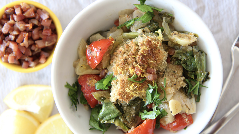 Recipe developer Jason Goldstein of Chop Happy recreated this popular dish, and let us just tell you — it is spectacular. Golstein shares that his favorite part is how easy it is to make. "I skipped the step of boiling the greens and shocking it. It maintains a slight crunchy texture to the escarole," he says. The recipe calls for prosciutto, but Goldstein shares that if you're a vegetarian, you can certainly leave it out.