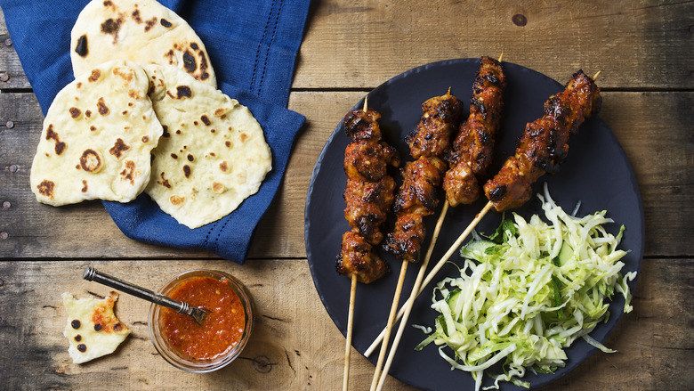 - To serve, divide the chicken skewers, slaw and flatbreads among 4 plates. Serve the remaining piri piri sauce alongside for dipping.