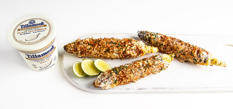 Make a healthier-but just as tasty-version of elote (Mexican grilled corn) with Tillamook 2% Greek Yogurt.