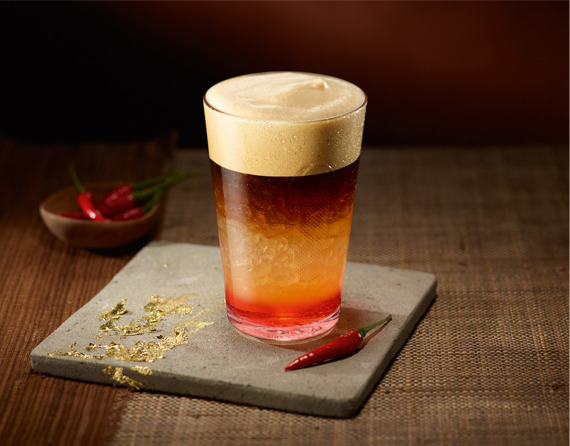 - Fill a cool glass with the crushed ice. Add the spicy pepper syrup and the mango juice on top.