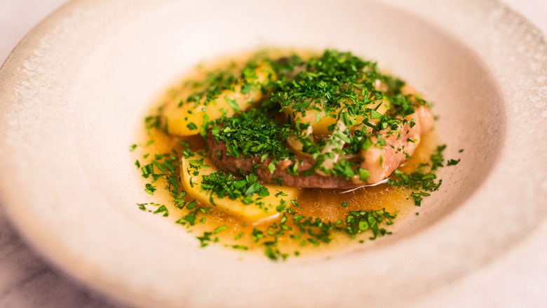 - Using a slotted spoon, divide the beef into bowls. Ladle the potato-onion broth into each bowl and sprinkle with the chopped parsley. Serve with the pickled vegetables.