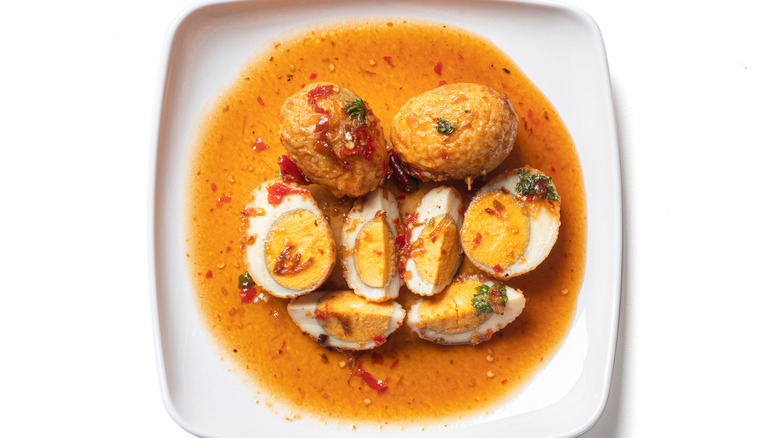 This dish is very popular in Thailand and is served with a variety of sauces, usually something sweet or sour to balance out the weight of the deep-fried boiled egg. Typically a sauce with shallots, palm sugar, oil, fish sauce, and some other seasonings is a great big hit, with added chilies if you feel like bringing the heat, per Atlas Obscura. It's not just an interesting name, son-in-law eggs also serve as a tasty treat and, in the direst of situations, a delicious warning.