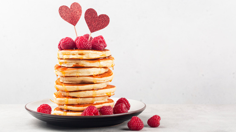 Pancakes can be whipped up in no time, and per Taste of Home, the short ingredient list calls for flour, sugar, baking powder, salt, milk, butter, and an egg or two, depending on how big of a batch you're making. Aesthetically, pancakes look simple and humble, but they're the epitome of comfort food for breakfast. They also pair exceedingly well with chocolate chips, fruit, whipped cream, butter, and of course, syrup.