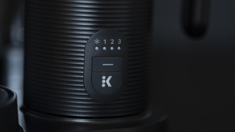 The frother is the black pitcher that comes in its own smaller box within the Keurig packaging. It has two basic settings: hot and cold froth. Toggling between the two might be confusing at first because we think the two buttons on the frother could have been a bit more distinguished from each other, but the upper, smaller button with the horizontal line will switch the frother's function between cold (the leftmost indicator light with a snowflake design) and the three settings of hot. The one, two, and three numbers indicate levels of froth or the ratio of bubbly foam to milk. The No. 1 setting is the least amount of foam, equivalent to a latte. The middle No. 2 setting makes a moderate amount of foam that was close to a wet cappuccino. An indicator light will glow on whichever setting is selected — blue when on cold, red when on hot froth settings — and the lower button with the K logo will run the frothing cycle.