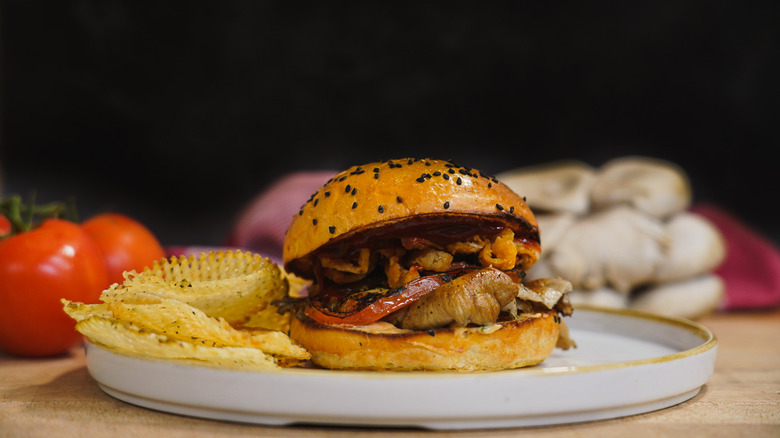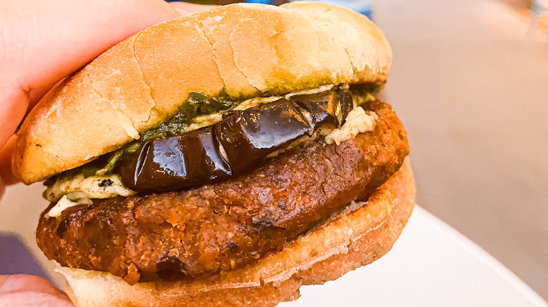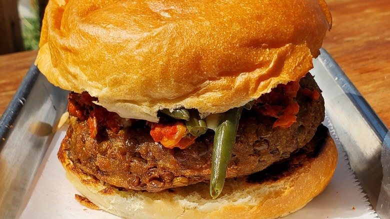 The No. 2 Housemade Vegan Burger is a prime example of that Farm Burger ethos, coupled with a hefty dose of Southern flavor. The patties are made with quinoa, black-eyed peas, kale, roasted mushrooms, and sweet potatoes, then grilled and accented with arugula, vegan mayo — made from chickpeas and sunflower oil — and tomato chow chow, a type of pickled relish used to preserve the summer bounty in Southern cooking (via Southern Living). That chow chow in particular is a nifty riff on typical tomato toppings, be it sliced tomatoes or ketchup, in that it adds a vibrant and acidic bit of Southern twang.