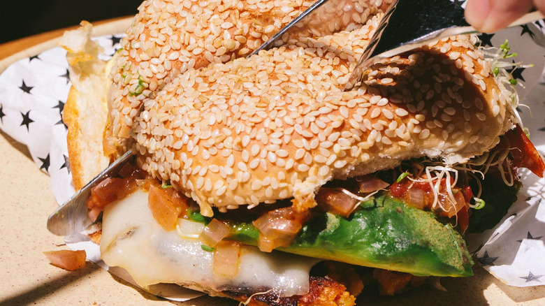 Inspired by an Indian street food staple called vada pav, a burger-like potato patty, per the Times of India, that the chef grew up eating in Mumbai, the burgers are made with a veggie-packed patty of carrots, beetroot, cauliflower, corn, green peas, potatoes, onions, garlic, ginger, green chili, and curry leaf. Once formed, the fragrant patties are grilled on the Tawa, a traditional Indian pan used for cooking flatbread, notes Mishry, and served with pao — otherwise known as pav, they're spongy rolls common in Mumbai, says Ruchik Randhap. Here, they're cut in half, toasted with butter, and coated with mint and cilantro chutney before being topped with the veggie burgers, a sprinkle of dry garlic chutney, and a sliced pickled jalapeño.