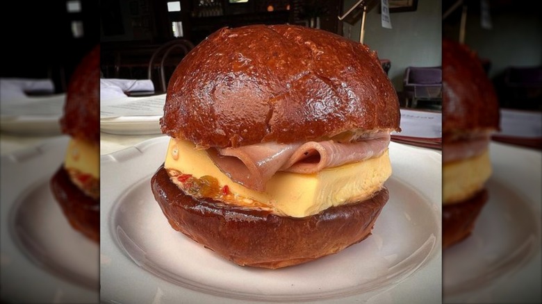 Their version of an egg and cheese sandwich is available during their Sunday lunch and is served on a pan au lait bun with pickled peppers and chili mayo. Instead of ham, Porcelain uses mortadella, an Italian emulsified sausage cold cut (per The Spruce Eats), and the egg is prepared steamed. If you want to try it yourself, head over to Queens to test the best sandwich of NYC that'll set you back $12 (tip not included).