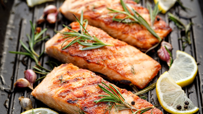 The red-informed sockeye nicknames spring from its wildly dynamic, saturated red, orange, and pink flesh, which happens to carry valuable nutrients. The vibrant color comes from the fish's diet, particularly the carotenoid antioxidant known as astaxanthin, which potentially protects the human nervous system, per The Healthy. That plankton-heavy diet also leads to higher vitamin B12 concentrations than all other salmon varieties. In addition, sockeyes carry high amounts of protein, roughly 18 grams per serving, and bring beneficial anti-inflammatory omega-3 fatty acids to sustain heart, brain, and joint health.