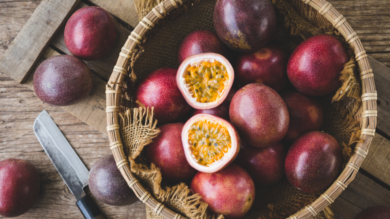 Passion fruit from the Passiflora vine is known for its tough purple or yellow skin and soft seed-filled innards (via Healthline). And while you wouldn't want to chew through the bitter rind, the flesh is sweet and juicy with a tropical flavor. People use the inner pulp to mix into cocktails, decorate desserts, brighten up salads, or add it to their breakfast for a little fruity pop.