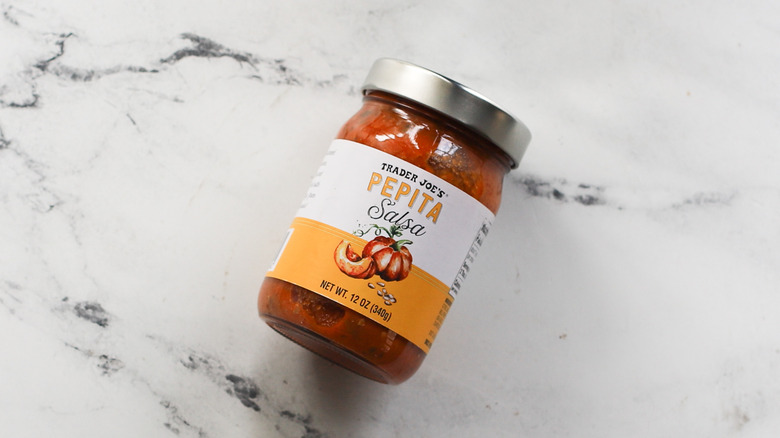Leave it to Trader Joe's to come up with a product so unique we couldn't help but buy it just to see what it tastes like. The Trader Joe's Pepita Salsa is one such product, calling out from the shelves like a rare wild animal. Pepita salsa isn't exactly revolutionary. There are plenty of native Mexican recipes for salsa that use pepitas for flavor and balance. In the aisles of Trader Joe's, however, it's refreshing to see a seasonal fall item that involves the beloved squash without using more pumpkin puree or spice. Seriously, there's a lot of pumpkin spice in that store.