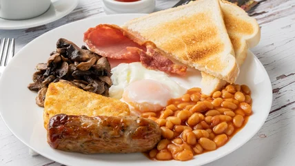 Today's full English breakfast looks very little like the 14th-century original, usually lacking the game meats and encompassing more variety. The U.K.'s contemporary morning meal includes bacon, eggs, sausage, baked beans, tomatoes, and mushrooms. You might also find bubble and squeak on the table, a dish that typically combines potatoes and cabbage, although other vegetables can be used.