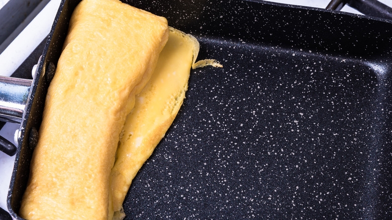 More is more when you're using oil to make this egg dish. If eggs stick to the bottom of your pan, your quest for the perfect foldable omelet could be foiled. As you roll up layers of cooked eggs, you will add more layers by lifting up the already cooked eggs and pouring in more of your seasoned mixture (per Just One Cookbook). Each subsequently cooked layer will be wrapped around the mass you've already formed. The goal here is to keep wrapping, and your little egg omelet will slowly grow in size.