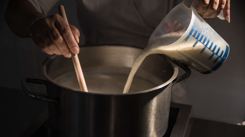 A pudding, on the other hand, has no aerator. Instead of air making up much of its volume, pudding is mostly made of milk thickened with some type of starch, per MasterClass. Pudding is also usually just made with milk or cream, sugar, and the thickening agent, which means that it comes together in a pan with some heat. Some puddings incorporate eggs to aid the thickening process, but most use cornstarch or flour.