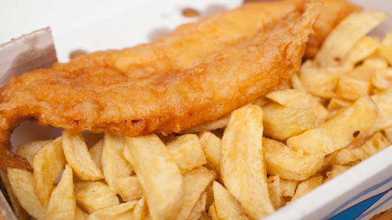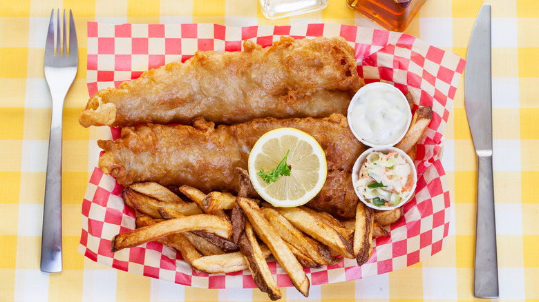 Fried fish sprung up in the U.K. during the early 1800s and chips came along about 60 years later (per Great British Mag). While the actual "inventor" of fish and chips is a bit hazy, the meal became a hit, and by 1930, over 35,000 fish and chip shops operated throughout the United Kingdom. Whether it's wrapped in newspapers or packaged in paper boxes, this crispy dish is widely enjoyed — but the sides and sauces accompanying the crispy duo vary greatly.