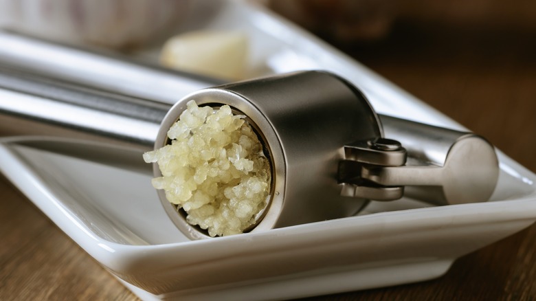 Of all the kitchen gadgets that have come and gone over the years, the garlic press has staying power. While you don't need extensive knife skills to be able to properly work with the garlic, the simple act of crushing the cloves and having them minced within a matter of seconds is highly appealing. While it is inconclusive to say that pressed garlic provides a better flavor than traditional knife-minced garlic — see Fine Cooking — devotees of either school are likely inclined to support their preferred method.