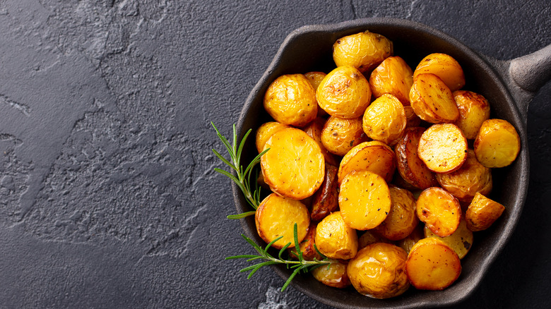 It sometimes seems that roasted potatoes are a less celebrated preparation in the potato world. After all, mashed potatoes are a featured player on the Thanksgiving table, and fries are the trusty sidekick in the fast-food arena. The Huffington Post pointed out that home fries ranked 9th place in DoorDash's list of most popular potato orders in 2019, and home fries are arguably just roast potatoes. This form of potato, while delicious, can be difficult to make. Achieving the perfect crisp outside with a buttery, soft inside isn't always intuitive. If you want to give roast potatoes the chance to shine, here are some tricks for making them perfectly at home.