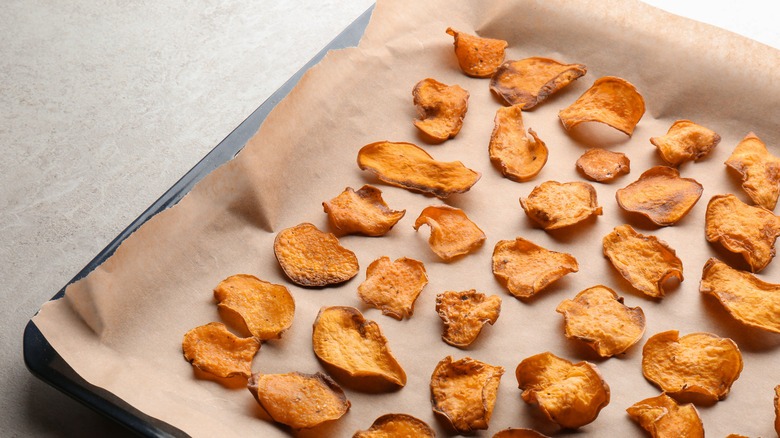 Goguma mallaengi means "dried sweet potato" in Korean, which provides a simplified yet accurate explanation of how the treat is made (via Maangchi). After baking or steaming the sweet potatoes, the cooked root veggies are left to cool, and their skin is removed. Once they're peeled, the potatoes are cut into small, bite-sized pieces — they can either be cut into rounds or small french-fry pieces — and placed inside of a dehydrator.