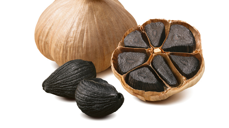 Weeks of low and slow cooking have profound and positive effects on garlic. The white skins of fresh garlic become a caramel color, and the cloves themselves turn black. Garlic flavors fade into the background, and a rich, complex sweetness emerges. People who have tasted black garlic often say it evokes flavors of molasses, anise, balsamic vinegar, and chocolate (via Black Garlic).