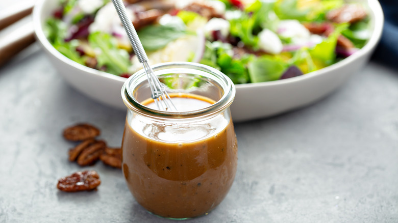In addition to being great on a salad, vinaigrettes are commonly used as a finishing sauce for red meat. To make this type of vinaigrette, add one head of black garlic, one teaspoon Dijon mustard, one teaspoon honey, 1/2 cup balsamic vinegar, and a pinch of salt into a bowl and puree until smooth. Then, slowly drizzle 1/2 cup olive oil into the bowl while continuously whisking (via Marx Foods Recipes).