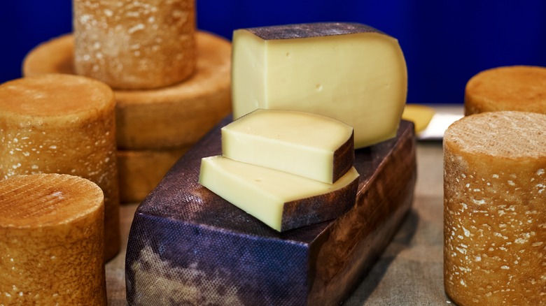 Natural rinds, as you might expect, form on their own when the air around the cheese naturally dries it out. More specifically, the salt within the cheese pushes moisture to the surface, which then evaporates and leaves behind a tough exterior (via MasterClass). This process is less involved than other methods of aging cheese, but the cheesemongers will occasionally dampen the outer layer with water, salt, or oil. They also flip the wheels weekly to ensure consistent aging, according to Cheese Grotto.