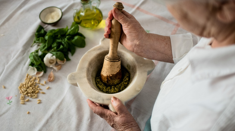 Agliata enters the picture in the middle ages, according to Via Verdi. This sauce is a pungent concoction of garlic, breadcrumbs or walnuts, olive oil, red wine vinegar, salt, and pepper. It is similar in texture to pesto and used much in the same way as an accompanying sauce for cooked pasta (via Taste Atlas). So, if you're a fan of pesto, it will be worth your while to try its savory ancestors. You'll be able to taste the history and inspirations behind one of Italy's most famous exports.