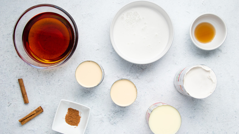 To make a batch of coquitos, you'll need coconut milk, coconut cream, condensed milk, evaporated milk, vanilla extract, cinnamon sticks, and ground nutmeg.