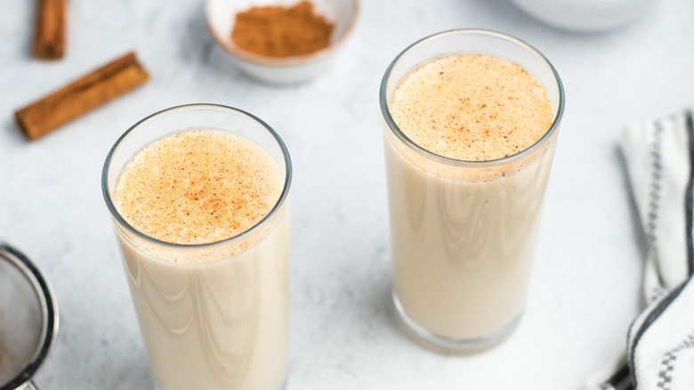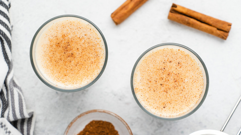 Once the drink has chilled, give it a quick stir, then pour out servings of coquito and top each with an extra dusting of nutmeg on top — this is optional, but advised. And now enjoy this drink that Brookes says is "definitely a great one for the holiday season!"