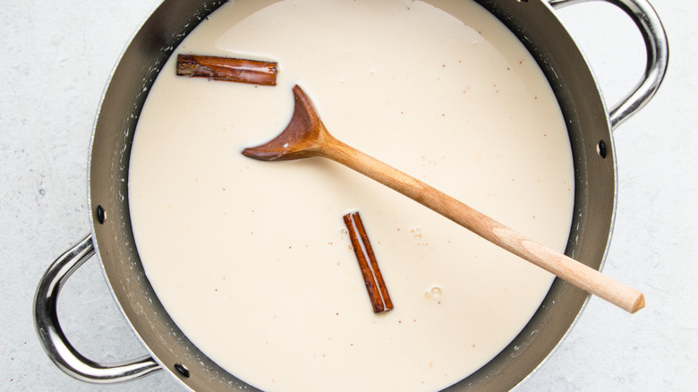 After the half hour of cooling and infusing time is up, add the rum or bourbon and stir the coquito well. Next, remove the cinnamon sticks and chill the beverage in the fridge until it is properly cold, giving it at least 1 to 2 hours. (You can transfer it to a pitcher or sealed container for this chilling.)