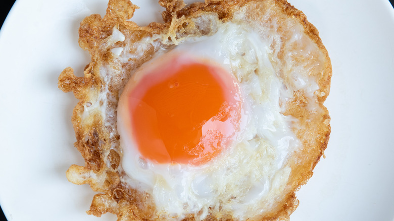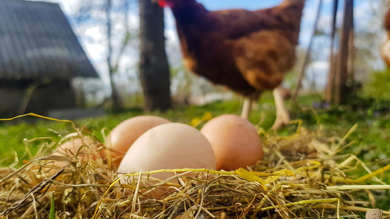 While chicken eggs are smaller than duck eggs, they nevertheless pack quite the nutritious punch. Here are some basic nutrient facts for one hen's egg according to the USDA: 72 calories, 4.75 grams of fat, 6.3 grams of protein, 0.5 milligrams of iron, and 24.2 milligrams of calcium. The total cholesterol is 184.5 milligrams, which is 61% of your daily value. Though this sounds high, Healthline posits that most healthy adults can eat one to two eggs per day without issue, depending on what the rest of their diet looks like. Chicken eggs are also sources of key vitamins such as B12, D, E, and a rather obscure nutrient called choline.