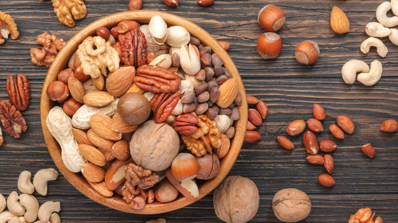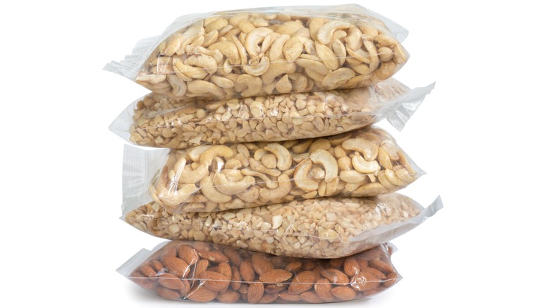 Some nuts keep fresh longer than others, explains Eat By Date. Pine nuts, for example, will only stay good for one to two months at room temperature, while nuts like macadamias, cashews, and peanuts will keep in the pantry for six to 12 months. To determine whether the nuts you have on hand are still good, there's one piece of specialized equipment that's your best guide — your nose. Nuts that have spoiled and gone rancid will have an unpleasant smell and should be discarded. And what's the best way to keep nuts fresh? Freeze them properly.