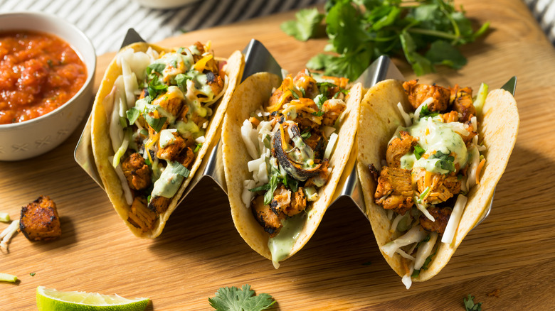 Tacos are one of the most customizable foods, making them a popular meal option for people of all dietary needs (via Beyond Type 2). Though beef, pork, and chicken are popular filling choices, tacos can easily be made vegetarian or vegan with grilled veggies or beans instead. Top them off with your favorite mild or fire-roasted salsa, cheese, and veggies, then enjoy! The love for tacos runs so deep that there's even a holiday for them. According to National Today, National Taco Day is celebrated on October 4 in the United States. Chain restaurants like Taco Bell, Chuy's, and On the Border often offer specials to celebrate the dish, often including lowered prices on tacos for the day or drinks.