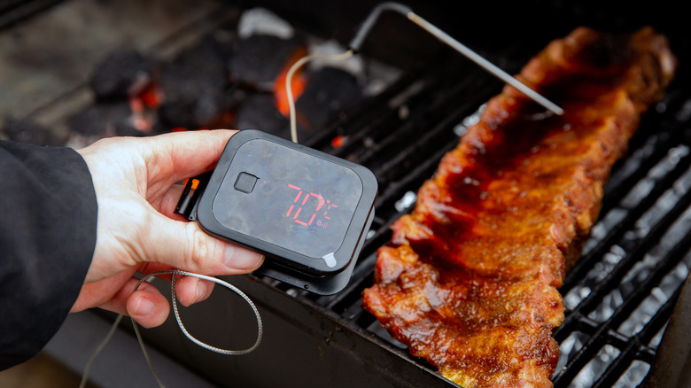 Take a thermometer, and you test it in the thickest part of the chicken that you're grilling — for beef, same thing. All these things have different temperatures, [including] pork, chicken, and beef, and you always look at them to make sure that the temperature that you Googled is the temperature that you're reading in the thickest part of the protein from your thermometer. This takes a lot of stress away.