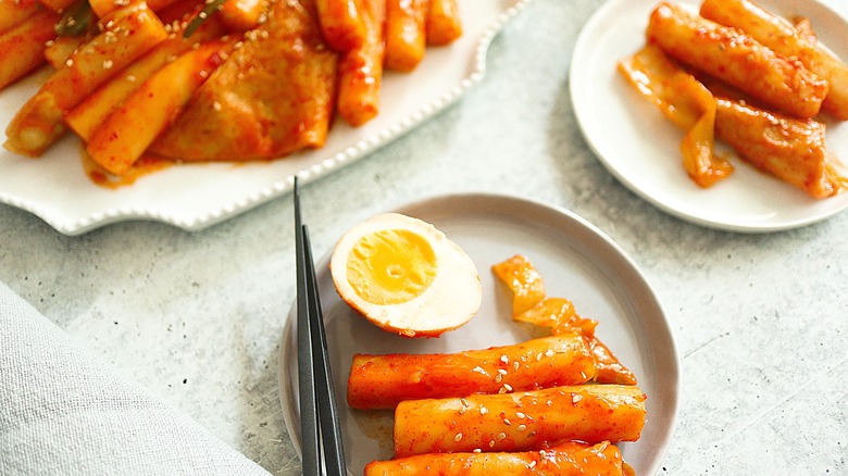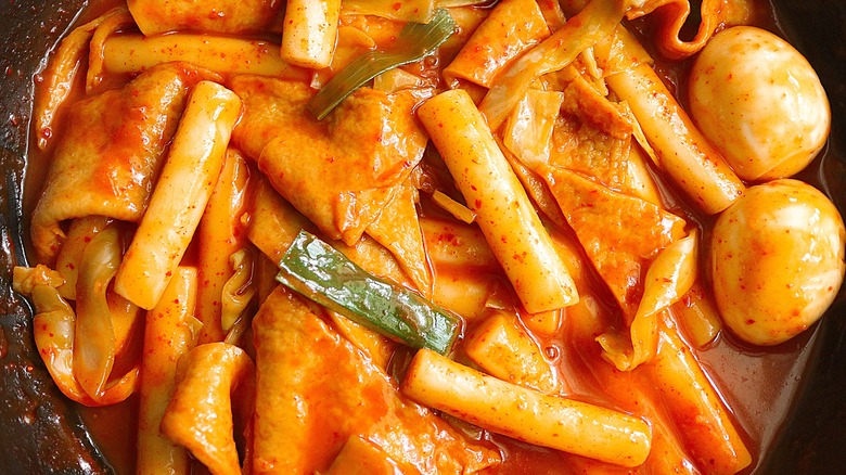 In Korean culture, tteokbokki (spicy rice cakes) is one of the most popular dishes you can make. According to Taste Atlas, the dish came to be in the Joseon dynasty period, which stretched from 1392 until 1910 (via Khan Academy). People used it as a cure for illnesses, and they served it to the royal court. However, it wasn't until the 1900s that the spicy chili paste called gochujang was introduced to this dish, giving it a very distinguishable bright red color. Today, people in Korea often enjoy tteokbokki as a street dish, but it may be hard to find if you don't live there. If you want a little taste of Korea right at home, then we have the spicy tteokbokki recipe for you.
