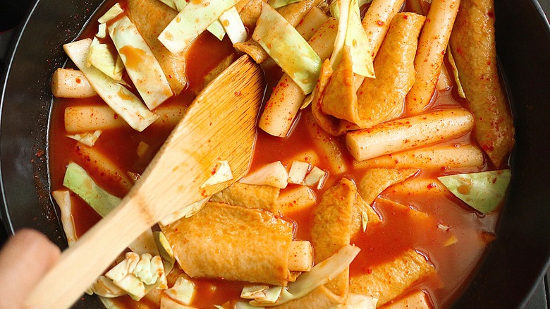 - In a large skillet over medium heat, add the anchovy broth (or water) and bring it to a boil. Add the reserved tteokbokki sauce, rice cakes, fish cakes, and cabbage. Continue to cook over medium heat until the rice cakes have softened and the sauce has thickened, about 5-7 minutes. Stir frequently to prevent the rice cakes from sticking to the pan. Check for seasoning by adding more gochugaru for extra spice or more sugar for added sweetness.