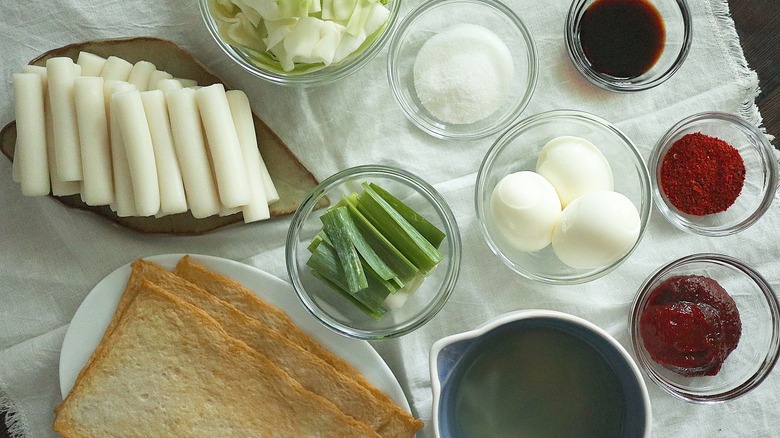 As with any other recipe, the first step in the process is to gather the ingredients. You will need gochujang (a Korean red pepper paste) and gochugaru (Korean red pepper flakes), soy sauce, sugar, Korean rice cake cylinders, fish cake sheets, anchovy broth or water, chopped green cabbage, a scallion, and boiled eggs. The recipe also calls for one optional ingredient — roasted sesame seeds for the garnish.